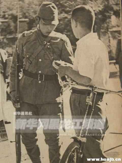 原图片说明:“在某市区街道,某部队的哨兵正在盘查过往行人。严厉的表情后面可以看到士兵强烈的好奇心。”
