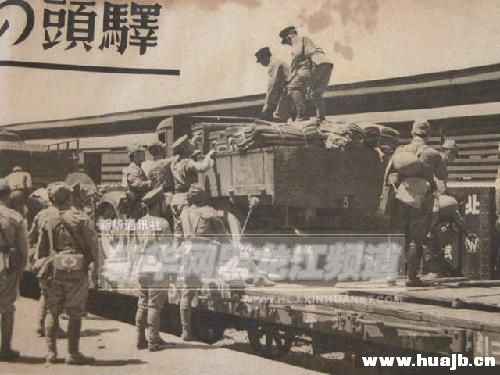 原图片说明:“在某火车站,某部队正在将卡车及辎重运上军用列车