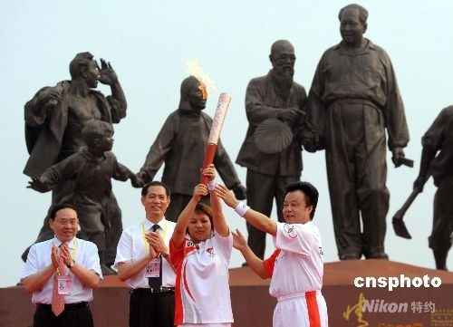 今天上午的起跑仪式是在8时开始的。湘潭东方红广场上,毛泽东一九五九年回韶山情景的巨型雕塑《乡情》成为一道独特的风景。全体人员首先为四川地震遇难同胞默哀一分钟。举重(搜吧)奥运冠军杨霞随后手持“祥云”,跑出了湘潭站的第一棒。