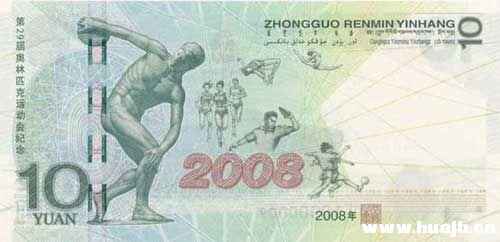 中新网7月6日电中国人民银行今日在其网站上发布公告,称定于2008年7月8日发行第29届奥林匹克运动会纪念钞一张。纪念钞面值10元,与现行流通人民币具有相同职能,与同面额人民币等值流通。 以下是公告内容: 中国人民银行定于2008年7月8日发行第29届奥林匹克运动会纪念钞一张。 一、纪念钞图案 第29届奥林匹克运动会纪念钞面额为10元,主色调为蓝绿色,票幅长148.5毫米,宽72.0毫米。 (一)正面图案。 该纪念钞正面主景图案为北京2008年奥林匹克运动会主会场——国家体育场,其上方为第29届奥林匹克运动会会徽图案,背景为天坛图案。票面左上角为光彩光变面额数字“10”,其下方为国家体育场水印图案;票面左下方为盲文面额标记,全息定位镂空标识,双色接线异型号码;票面右侧自上而下分别为中华人民共和国国徽图案,凹印手感线,面额数字“10”与“拾圆”字样。 (二)背面图案。 该纪念钞背面主景图案为古希腊雕塑“掷铁饼者”、运动员群像图案及“2008”字样。主景图案下方为年号“2008”及行长印章。票面左侧为“第29届奥林匹克运动会纪念”、面额数字“10”、汉语拼音“YUAN”字样及光变全息开窗安全线;票面右上方为“中国人民银行”汉语拼音行名及蒙、藏、维、壮四种民族文字的“中国人民银行”字样和面额。 二、防伪特征 (一)光彩光变面额数字。 位于票面正面左上方。垂直观察,面额数字呈绿色,中部有横向亮条;平视时,面额数字呈蓝色。随着观察角度的改变,面额数字颜色在绿色和蓝色之间交替变化,同时亮条呈现上下滚动效果。 (二)水印。 位于票面正面左侧空白区域。透光观察可见清晰的北京2008年奥林匹克运动会主会场——国家体育场图案,其上方为具有明暗渐变效果的面额数字水印“10”,下方为“第29届奥林匹克运动会”字样。 (三)全息定位镂空标识。 位于票面正面左下方。标识主景图案为古希腊雕塑“掷铁饼者”,上方为面额数字“10”、下方为“2008”。变换角度观察时,标识的颜色和明暗随之变化。透光观察,可见镂空文字“BEIJING2008”、“29”字样。 (四)双色接线异型号码。 位于票面正面主景图案左下方。冠字号码前四位为上边红色与下边黑色接线,后五位为上边黑色与下边红色接线。 (五)珠光图案。 位于正面主景右方,平视时,可见“”、“10”等图案。 (六)雕刻凹版印刷。 票面正面北京2008年奥林匹克运动会主会场——国家体育场图案、中国人民银行行名、国徽图案、第29届奥林匹克运动会会徽图案、手感线等均采用雕刻凹版印刷,用手触摸具有明显凹、凸感。 (七)光变全息开窗安全线。 票面背面左侧有5.5毫米宽光变全息开窗安全线,安全线两侧有缩微文字“BEIJING2008”,中间有全息图案“10”。变换角度观察时,安全线两侧颜色在绿色与品红色之间交替变化。 (八)胶印缩微文字。 票面正、背面胶印图案中有 “BEIJING 2008”、“10”及“同一个世界 同一个梦想”字样的胶印缩微文字。 三、该纪念钞发行数量为600万张。 四、该纪念钞与现行流通人民币具有相同职能,与同面额人民币等值流通。 中国人民银行 二〇〇八年七月二日