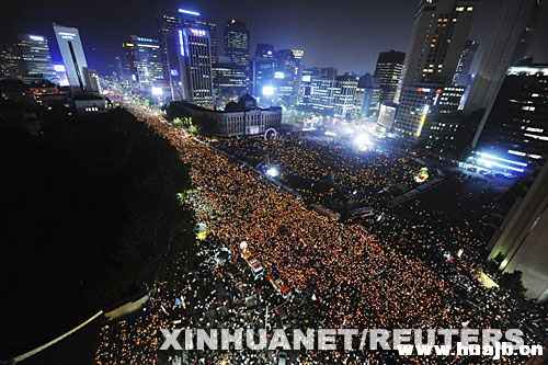 因担忧进口美国牛肉可能给韩国带来疯牛病隐患,约100万韩国人当天走上街头参加抗议。韩国今年4月与美国达成开放市场进口美国牛肉协议,但遭到国内强烈反对,引发一系列抗议活动。 新华社/路透